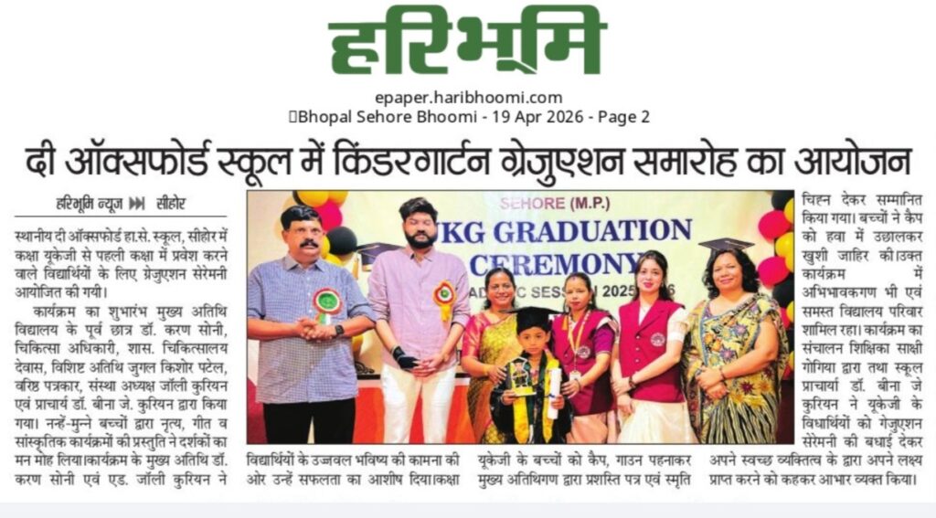 स्थानीय दी ऑक्सफोर्ड हायर सेकेण्डरी स्कूल सीहोर में दिनांक 26 नवंबर 2021 को संविधान दिवस के अवसर पर संविधान की प्रस्तावना का वाचन किया गया। संस्था अध्यक्ष जोली कुरियन द्वारा संविधान दिवस के अवसर पर संविधान की प्रस्तावना का वाचन कर, विद्यार्थियों को संविधान द्वारा प्रदत्त अधिकार एवं कर्तव्य से विस्तार से अवगत कराया गया। जोली कुरियन द्वारा बताया गया कि विद्यार्थी राष्ट्र का भविष्य होते हैं। अतः उन्हें संविधान द्वारा दिए गए अधिकार एवं कर्तव्यों का पालन कर आदर्श नागरिक की भूमिका निभाना चाहिए। इस अवसर पर प्राचार्या डॉ. बीना जे. कुरियन एवं समस्त विद्यालय परिवार उपस्थित रहा।