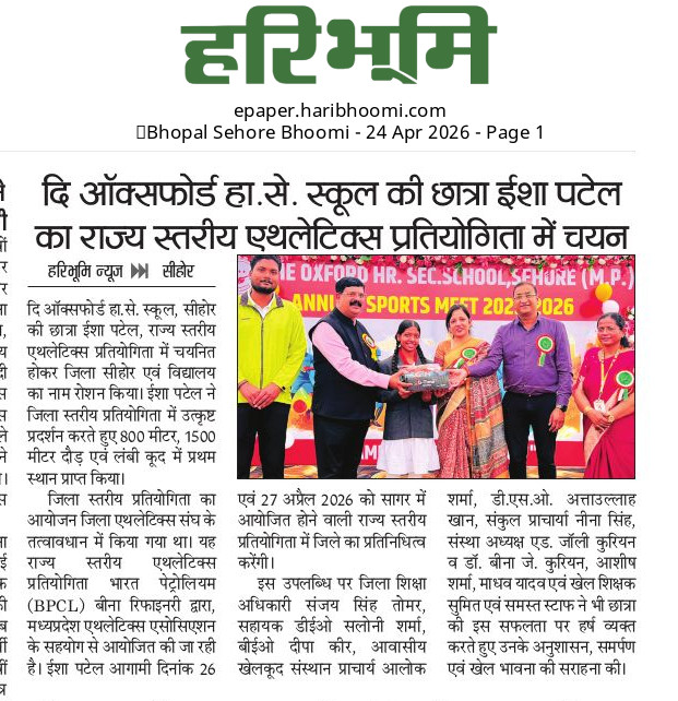 Phone: 07562-224656, 8269559878 Email: oxfordschool_shr@yahoo.in Address : Near Housing Board,Indore Bhopal Road, Sehore-466001 (M.P.). CLASSES : TIME Play group – 5th : 8:15 am to 1:15 pm 6th-12th : 7:15 am to 1:15 pm