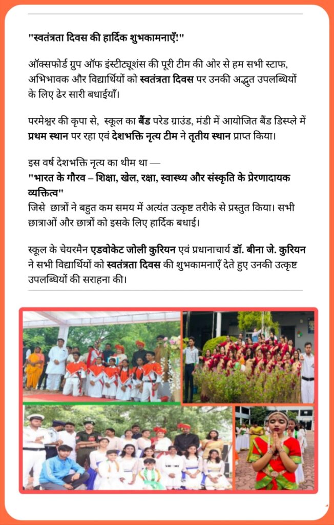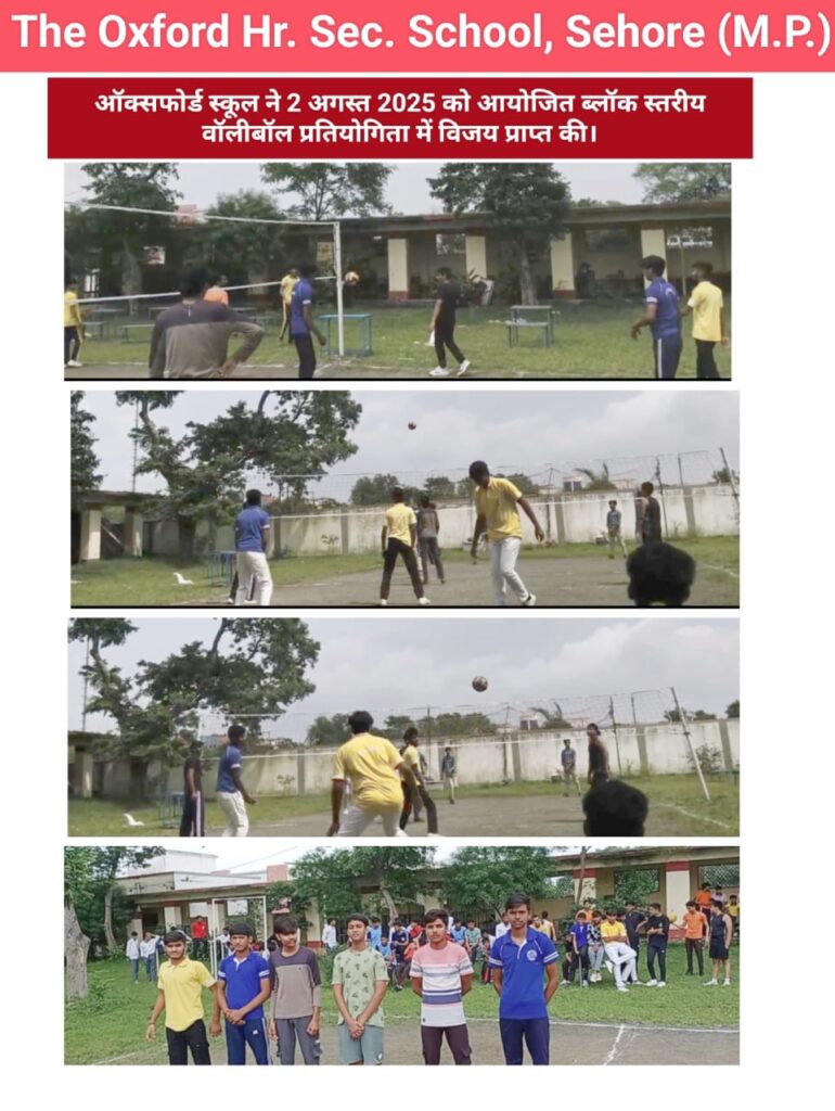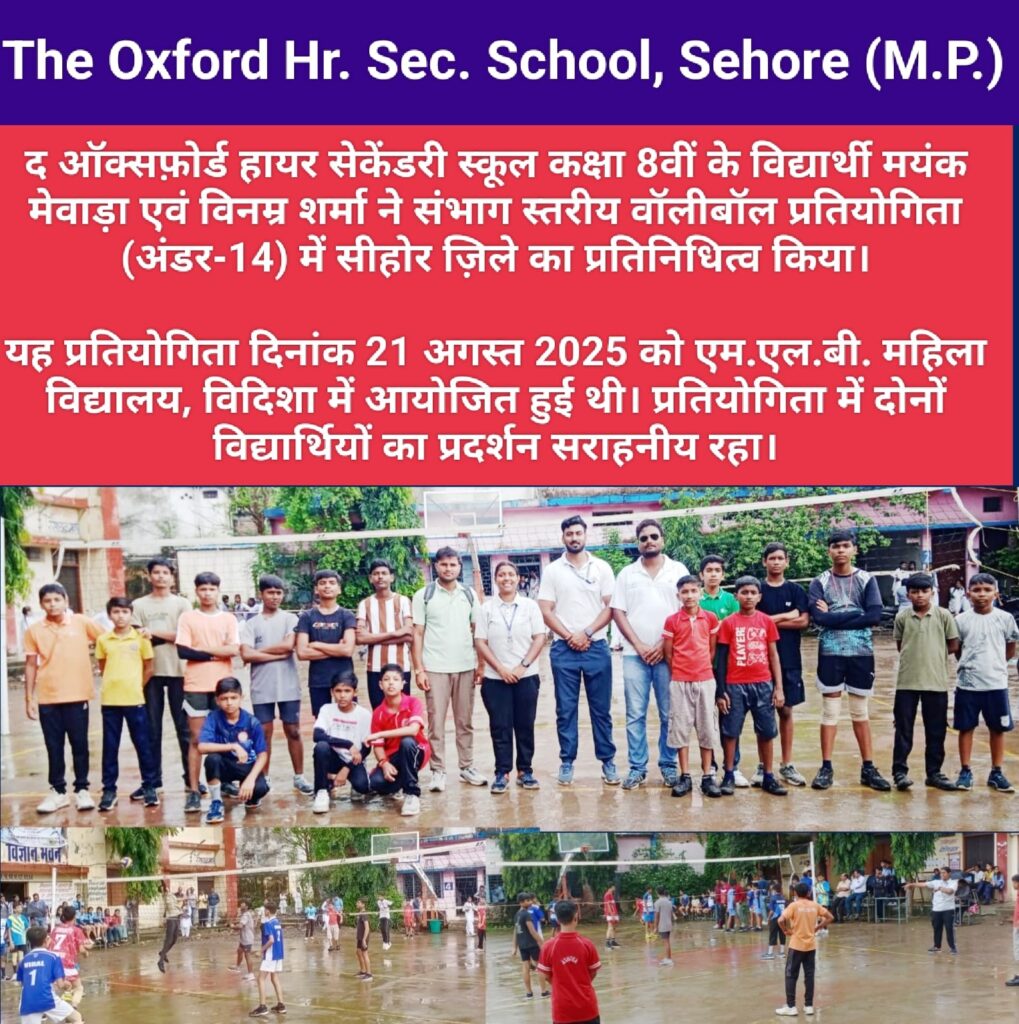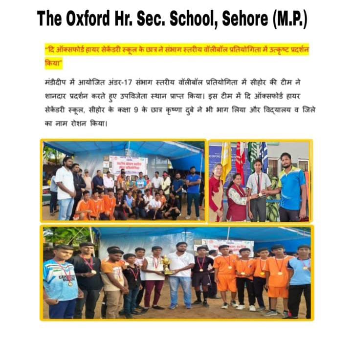 मंडीदीप में आयोजित अंडर-17 संभाग स्तरीय वॉलीबॉल प्रतियोगिता में सीहोर की टीम ने शानदार प्रदर्शन करते हुए उपविजेता स्थान प्राप्त किया। इस टीम में दि ऑक्सफोर्ड हायर सेकेंडरी स्कूल, सीहोर के कक्षा 9 के छात्र कृष्णा दुबे ने भी भाग लिया और विद्यालय व जिले का नाम रोशन किया।